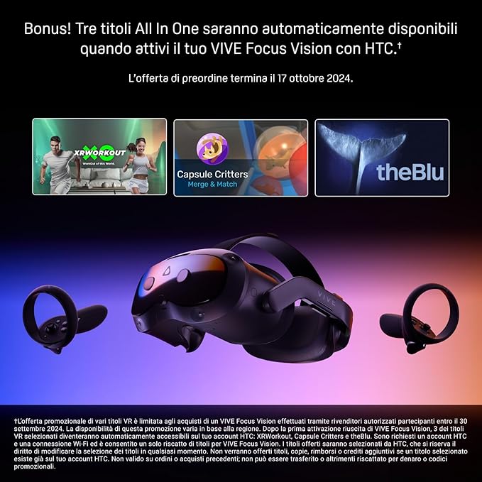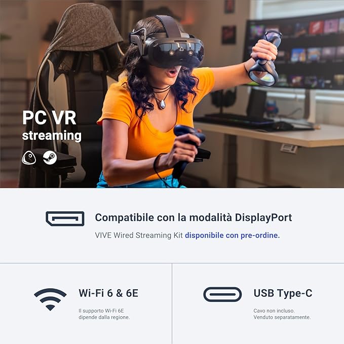 *L’offerta promozionale di un (1) VIVE Wired Streaming Kit (compatibile con la modalità DisplayPort) e (6) titoli senza costi aggiuntivi è disponibile per ogni ordine di un VIVE Focus Vision effettuato dal 7 maggio 2025 al 30 giugno 2025.
