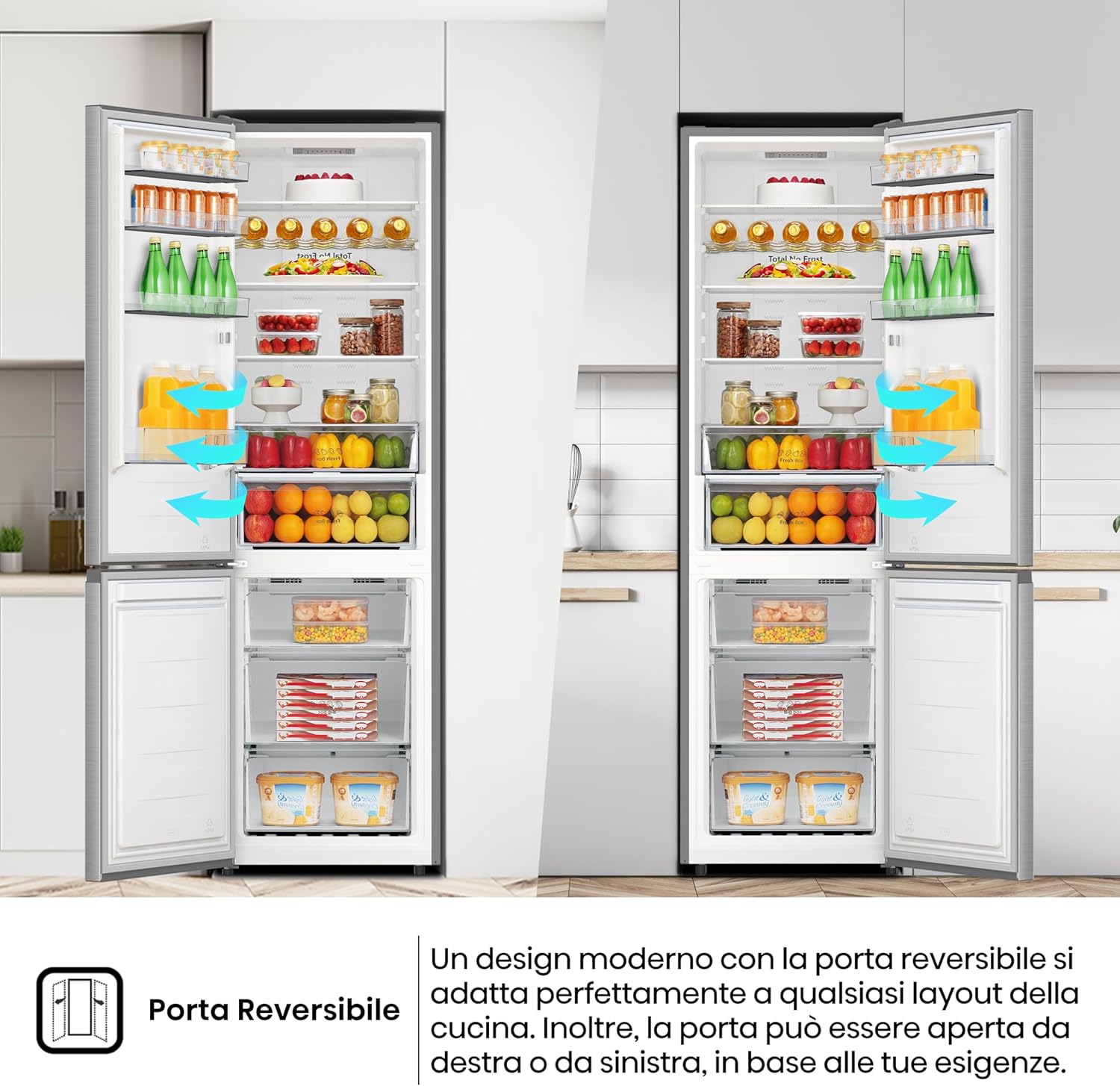 La porta reversibile consente un'installazione flessibile, adattandosi a ogni tipo di cucina. La finitura inox anti-impronta completa il look moderno e professionale del frigorifero.