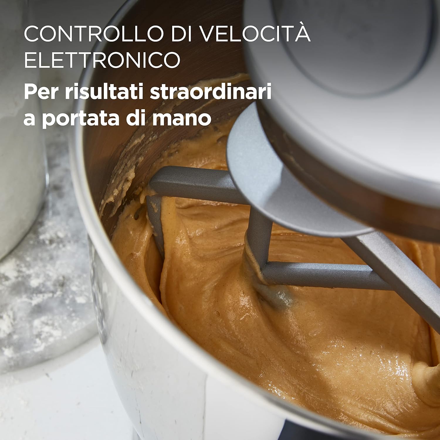 Grazie al suo movimento planetario e agli utensili professionali inclusi (frusta K, gancio impastatore, frusta a filo), garantisce risultati perfetti anche nelle preparazioni più delicate. Inoltre, è compatibile con oltre 20 accessori opzionali (non inclusi), per trasformarsi in un centro di lavoro culinario completo: tritacarne, sfogliatrice, grattugia, gelatiera e molto altro.