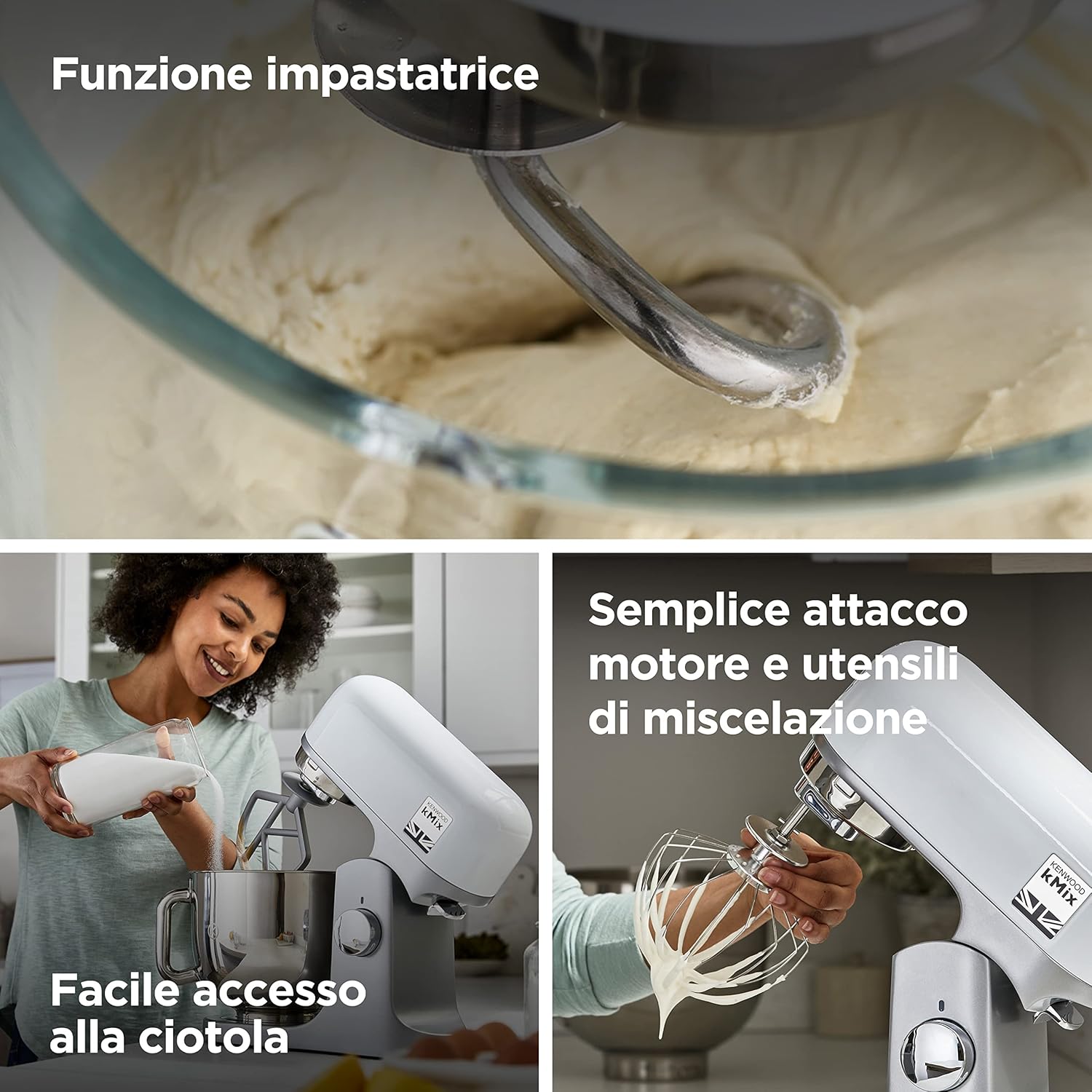 Robot da cucina Kenwood KMIX KMX750WH, colore bianco, motore da 1000W, ciotola in acciaio inox da 5L con manico. Include 3 utensili per la miscelazione. Oltre 20 accessori disponibili separatamente per una personalizzazione completa.