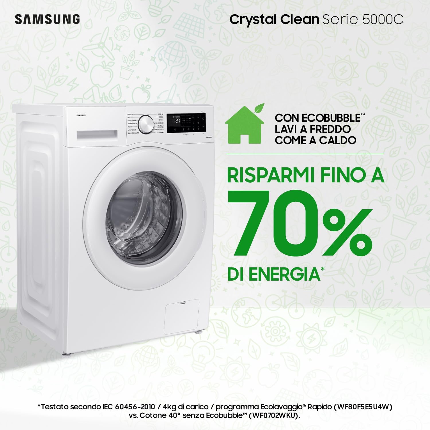 La Samsung Lavatrice Crystal Clean WW90CGC04DTEET unisce prestazioni elevate, tecnologie intelligenti e un design elegante per offrirti un’esperienza di lavaggio superiore. Con una capacità di 9 kg, è perfetta per nuclei familiari numerosi o per chi desidera gestire grandi carichi in meno cicli. Il cuore di questa lavatrice è la tecnologia EcoBubble™, che trasforma il detersivo in bolle efficaci anche a basse temperature, garantendo un pulito profondo con meno energia.