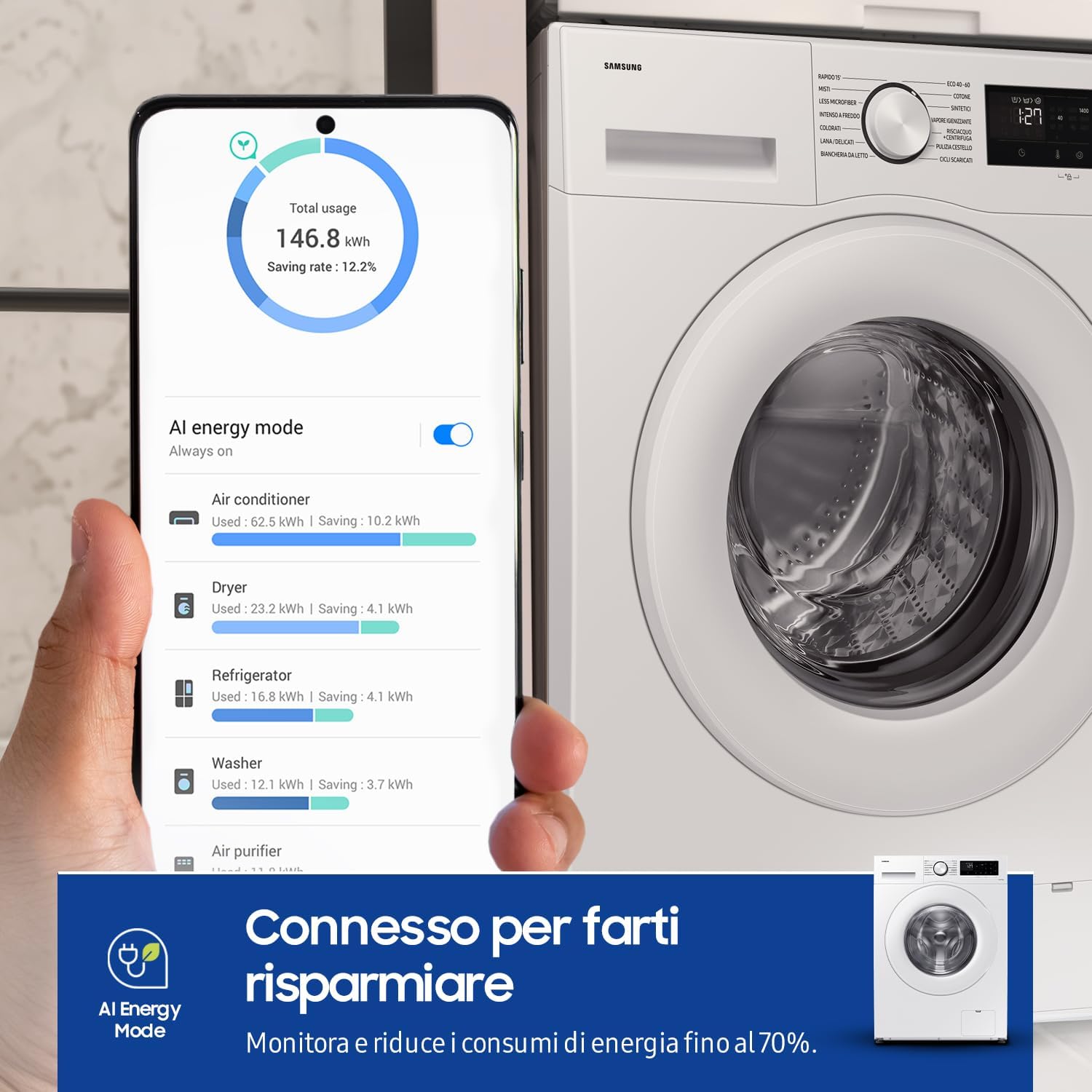 Il vapore igienizzante elimina fino al 99,9% dei batteri e degli allergeni, rendendo i tuoi capi più sicuri per tutta la famiglia, anche per i più sensibili. Grazie alla connessione Wi-Fi e all’app SmartThings, puoi gestire la lavatrice ovunque ti trovi: avvia, controlla o ricevi consigli di lavaggio personalizzati in tempo reale.